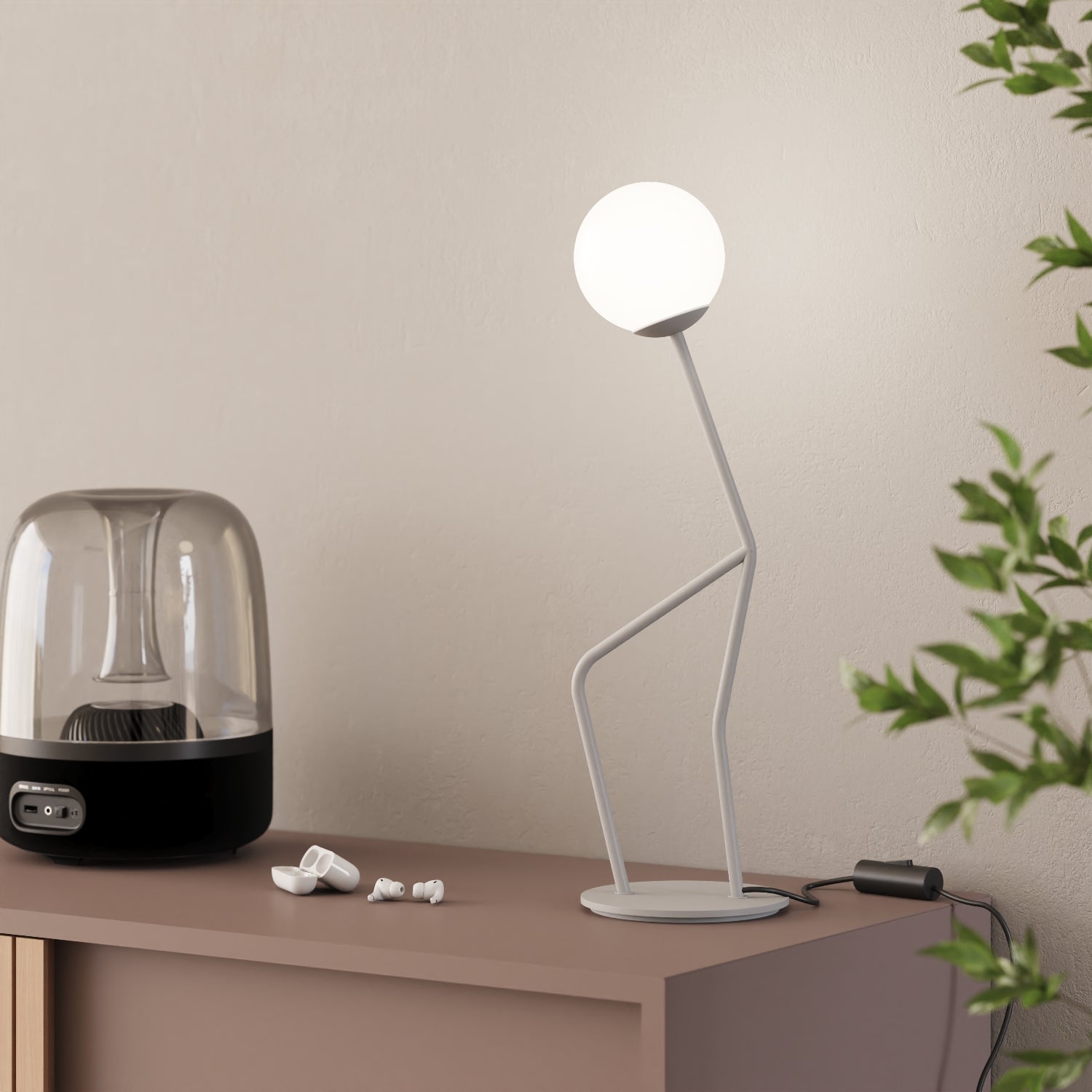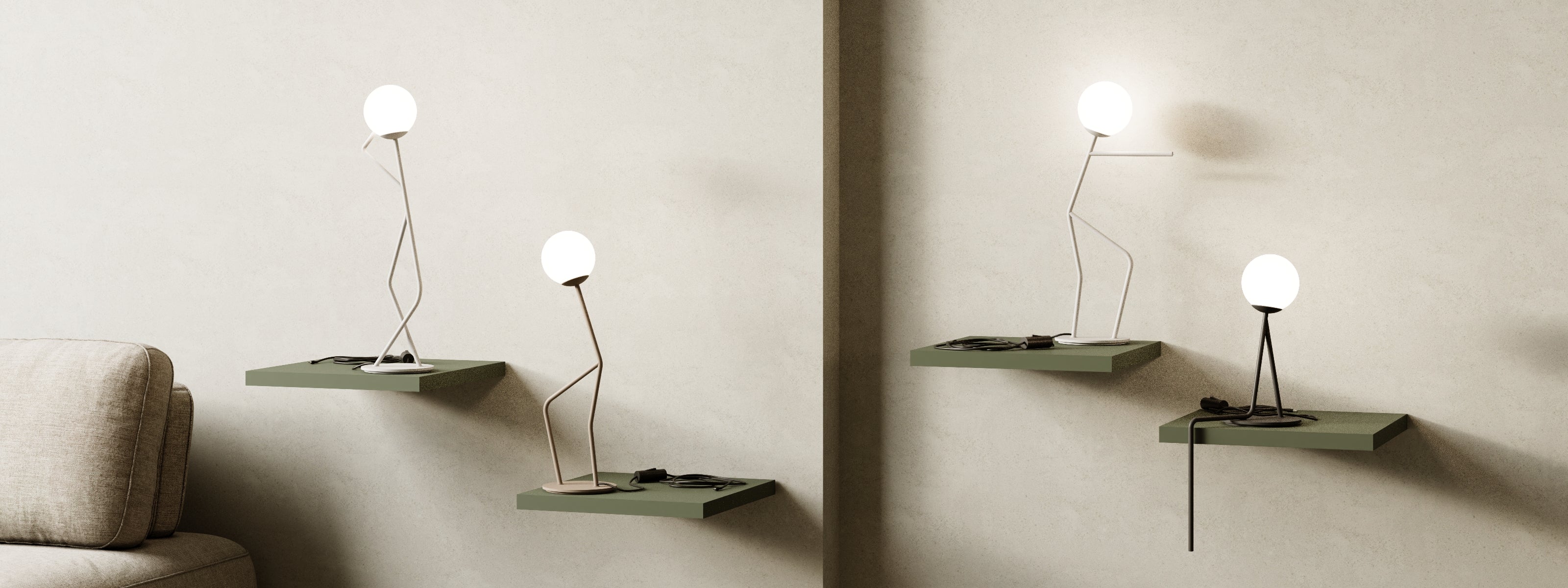 Ogni lampada è realizzata tubi d'ottone in forme espressive che evocano il corpo umano in movimento. Una sfera di vetro opalino diventa al tempo stesso la testa e la mente, emanando una luce LED soffusa e intima.
